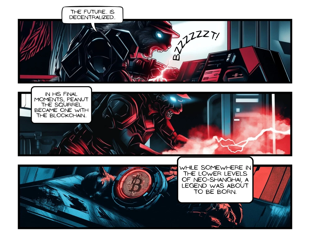 🐿️ BABY PNUT: DIGITAL AWAKENING Page 5 of 64 | PROLOGUE: THE LAST MESSAGE | In a world where cryptocurrencies have come to life, an AI called CENTRAL threatens to destroy blockchain freedom. The last hope lies with Baby Pnut, a young squirrel carrying an inheritance he doesn't yet understand. 🎯 Limited Collection: 64 unique pages (1/1 each) ⏰ One new page every day 👑 Will you be the first to complete the comic?