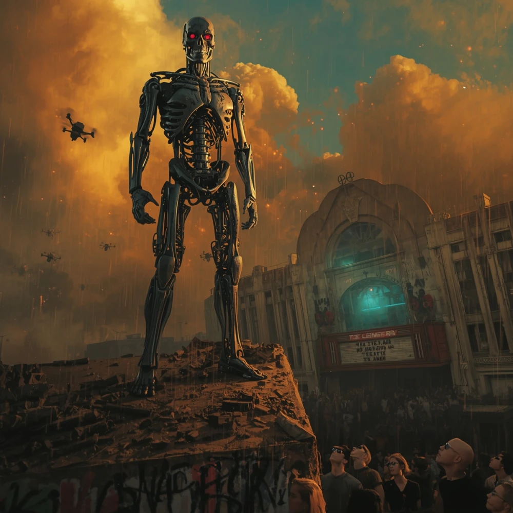 In the shattered reels of 2049 Los Angeles, where Hollywood's ghosts flicker under rusty skies, rises the Eternal Eternity Enforcer — a Terminator reborn as the ultimate guardian of forgotten dreams. Perched on the crumbling edge of the Hollywood Eternity theater, his chrome skeleton gleams through cracked human flesh, red eyes scanning the horizon for Skynet's shadows. Tattooed with 'Protect the Spark' on his battle-scarred shoulder, he wields a plasma blaster humming with blue fury and a shield forged from a tattered poster: 'Lights, Camera, Revolution!'. Below, survivors — neon hackers, graffiti rebels, and wide-eyed dreamers with VR relics — gaze up in awe, their hope etched in the embers of resistance.This isn't just a machine; it's your rewrite of destiny. An NFT etched with a film reel tag on his chest, eyes mirroring Matrix code or your own cinematic fever dream. Holograms whisper: 'The Reel is Yours — Rewrite the End.' Own the enforcer. Direct the apocalypse. Lights, Camera... Eternity.Edition: 1/1 | Rarity: Mythic | Traits: Post-Apoc Hero, Cyberpunk Noir, Guardian Mode