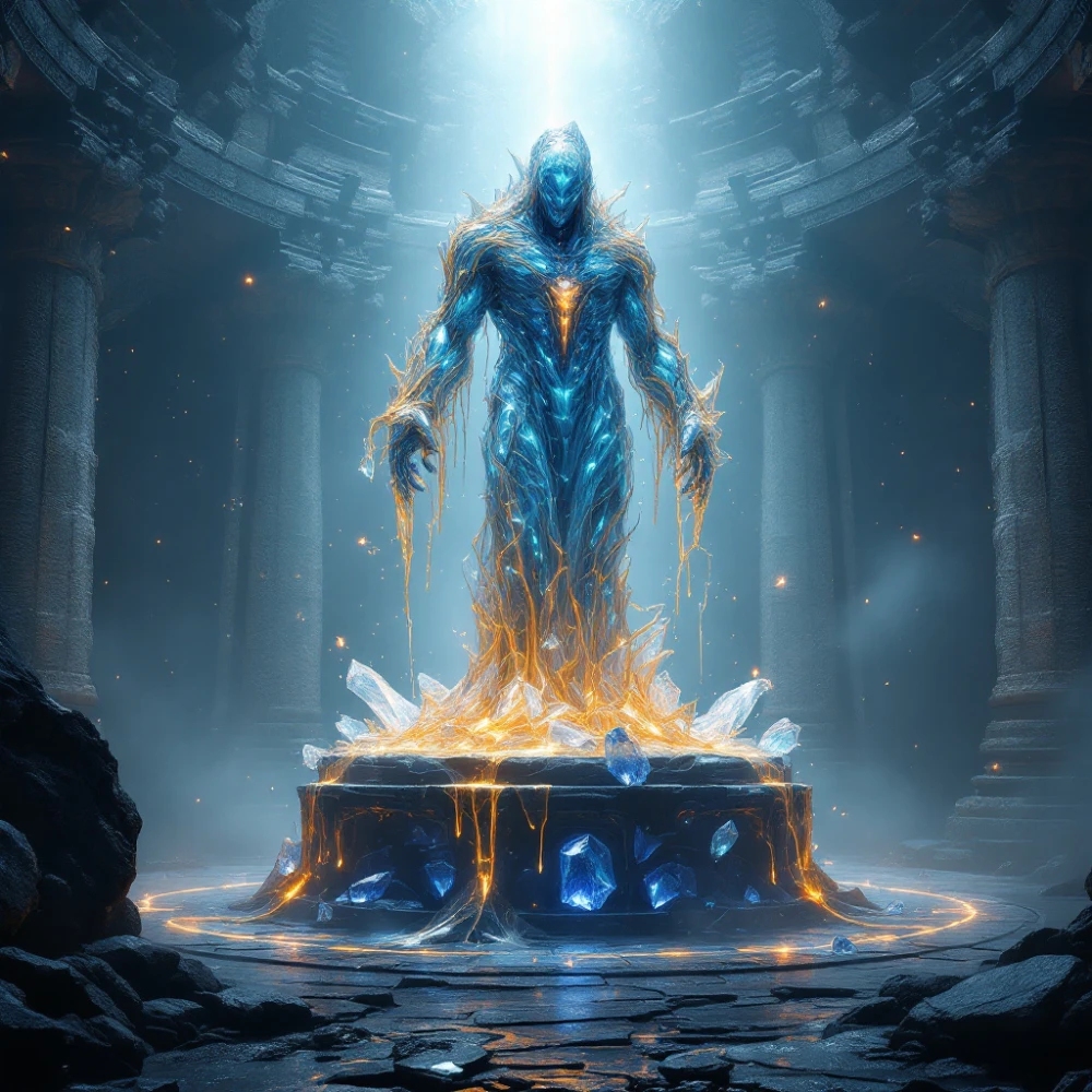 Behold the Auric Guardian, a towering monolith forged from the very essence of the earth’s golden wealth and the unfathomable depth of the oceans. This entity does not merely stand; it protects. Constructed from layers of molten gold and suspended shards of vibrating blue crystals, the Guardian channels the energy of a forgotten civilization. The golden skin ripples like liquid mercury in the presence of great ambient magic, while the sapphire core pulses with a rhythm that syncs with the heartbeat of the crypto world. It stands as a symbol of impenetrable wealth and ancient wisdom. Holding a heavy bar of unrefined gold in one hand, inscribed with the sigil of the Old Market, the Guardian glares unblinkingly at chaos, offering safe harbor to those who seek true digital legacy. The setting breathes life into the legend, floating amidst ruins of a bygone era, surrounded by floating orbs of pure data. This piece represents the ultimate merger of scarcity and value—a must-have for any elite collector. RARITY: Legendary Gold Tier POWER: High
