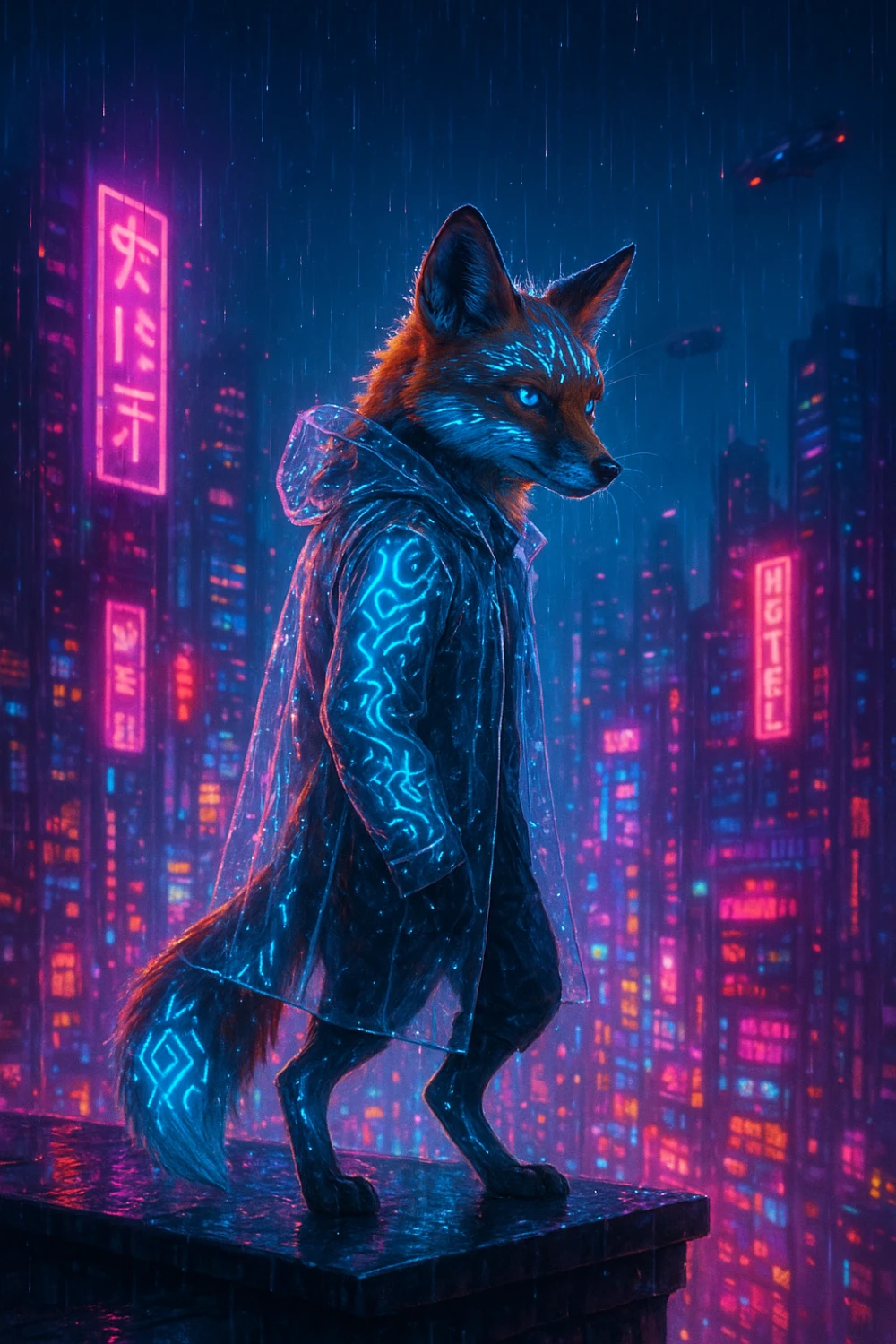 Neon Fox of New Terra In the heart of New Terra’s sleepless neon night, a lone cyberpunk fox watches over the city from a glowing rooftop. Holographic tattoos pulse gently beneath its fur, echoing secret data streams and forgotten memories of the old world. This piece blends anime aesthetics with futuristic sci‑fi vibes, capturing a moment of quiet rebellion above a chaotic, neon-drenched metropolis. Every reflection in the rain-soaked streets below tells a different story — but the fox remains, calm, aware, and unbroken.