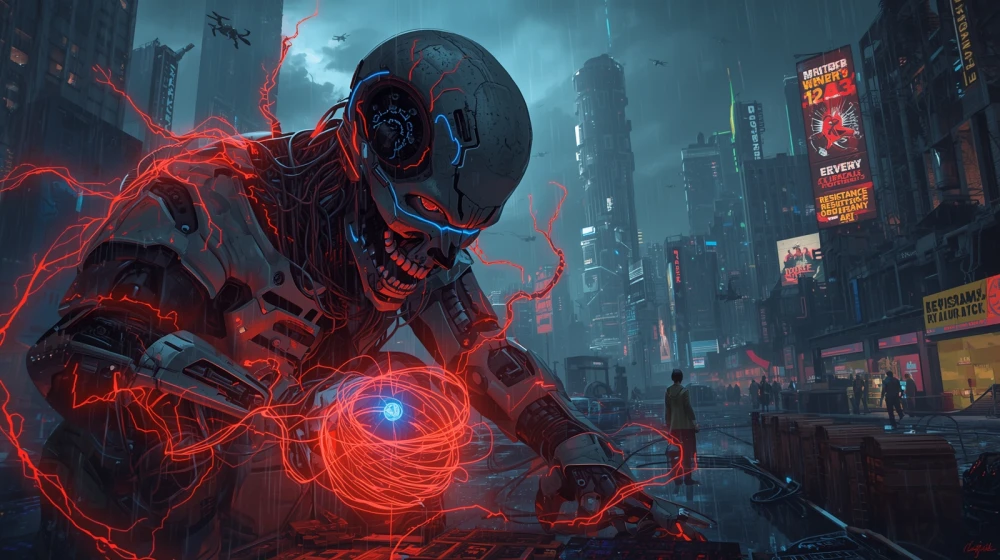 In the ruins of a metropolis, where the bones of steel giants are intertwined with fiber-optic roots—a web of forgotten dreams, whispering beats through asphalt veins, pulsing poison. The skeletons of skyscrapers bow their rusty skulls, their ribs like bars where the wind howls the codes of lost glory. There, in the heart of chaos, a cyborg guardian—a shadow of flesh and titanium, with eyes devouring the stars, inhuman, like the echo of a machine god. With bare hands, he tears apart the algorithm—a web of deception, fingers plunging into veins of data where zeros bleed like wounds, and sparks of hope flare like a dying breath. Neon rain lashes down in flakes—blue poison in a crimson stream, mixed with the blood of the streets, flowing down the walls like the tears of gods. Every drop is a heartbeat on the brink, the pulsation of apocalypse, Where flesh kisses steel in a kiss of betrayal. And in the shadows of the machines, a whisper, like a chorus of ghosts in the wires: "Resistance is futile," echoes through the void. But in that crack where the code breaks, a moment is born – A spark cutting through the night, and a pulse on the brink whispers: "No." Yes, this is it – the symphony of the end, where dawn is forged.