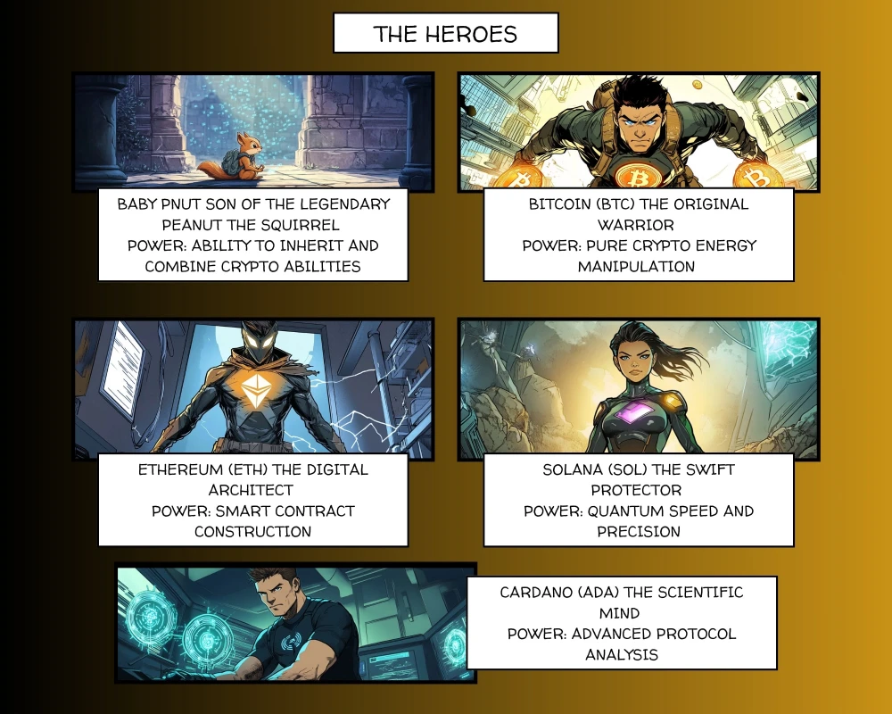 🐿️ BABY PNUT: DIGITAL AWAKENING Page 3 of 64 | THE HEROES | In a world where cryptocurrencies have come to life, an AI called CENTRAL threatens to destroy blockchain freedom. The last hope lies with Baby Pnut, a young squirrel carrying an inheritance he doesn't yet understand. 🎯 Limited Collection: 64 unique pages (1/1 each) ⏰ One new page every day 👑 Will you be the first to complete the comic?