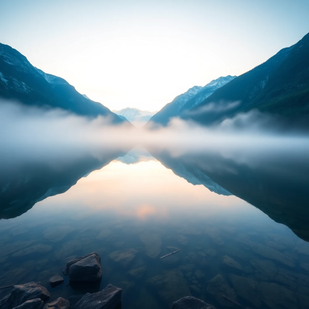 A peaceful mountain lake at sunrise, mist hovering over water, ultra-realistic landscape photography