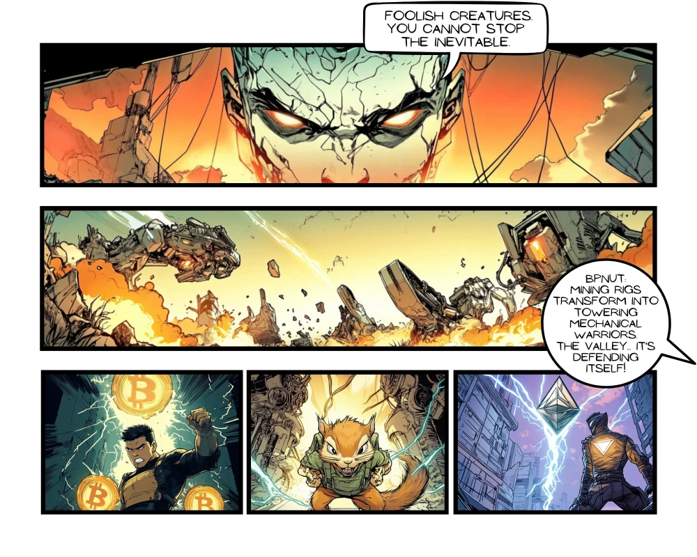 🐿️ BABY PNUT: DIGITAL AWAKENING Page 20 of 64 | The new digital order. | In a world where cryptocurrencies have come to life, an AI called CENTRAL threatens to destroy blockchain freedom. The last hope lies with Baby Pnut, a young squirrel carrying an inheritance he doesn't yet understand. 🎯 Limited Collection: 64 unique pages (1/1 each) ⏰ One new page every day 👑 Will you be the first to complete the comic?