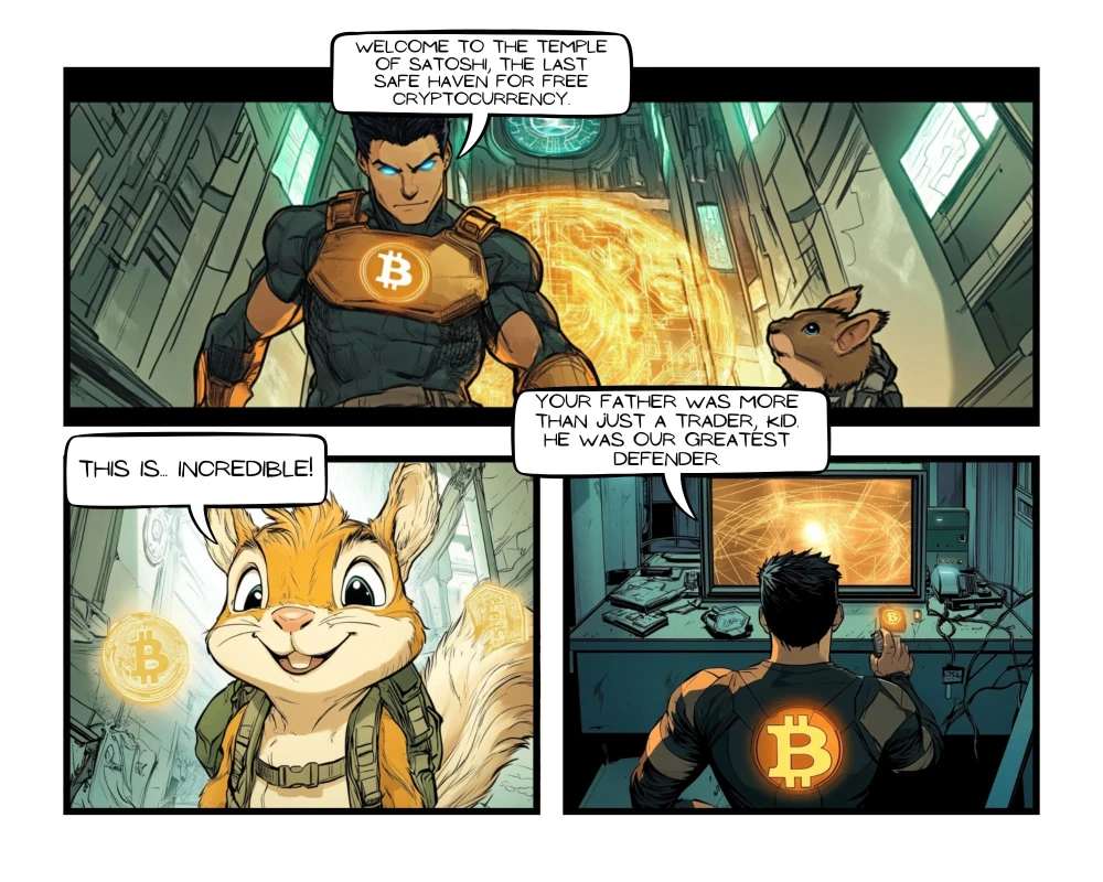🐿️ BABY PNUT: DIGITAL AWAKENING Page 10 of 64 | The new digital order. | In a world where cryptocurrencies have come to life, an AI called CENTRAL threatens to destroy blockchain freedom. The last hope lies with Baby Pnut, a young squirrel carrying an inheritance he doesn't yet understand. 🎯 Limited Collection: 64 unique pages (1/1 each) ⏰ One new page every day 👑 Will you be the first to complete the comic?
