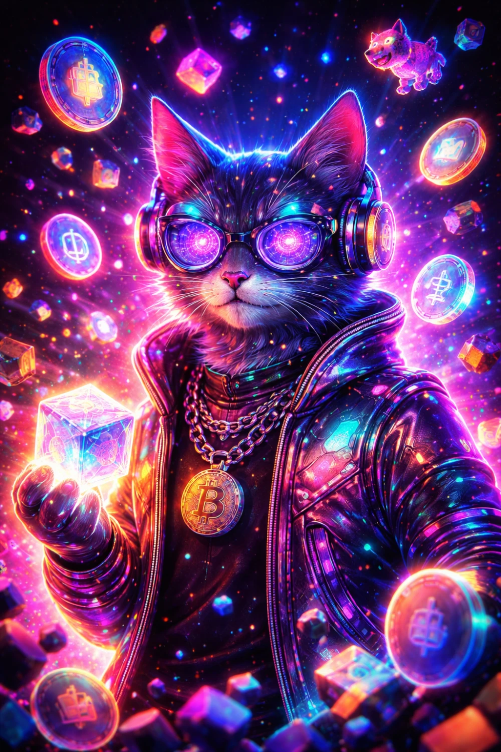 Neon Crypto Guardian is a futuristic cyberpunk protector of the decentralized universe. Surrounded by floating digital assets and glowing blockchain energy cubes, this character symbolizes creativity, ownership, and freedom in Web3 culture. A tribute to creators building the future of digital identity and value.
