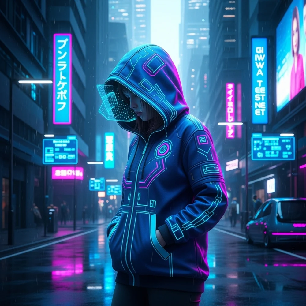 The unseen operator working within the matrix of the GIWA Testnet. A translucent digital interface masks her identity, symbolizing the process of data filtering, anonymity, and deep-level interaction required to test and secure the network.