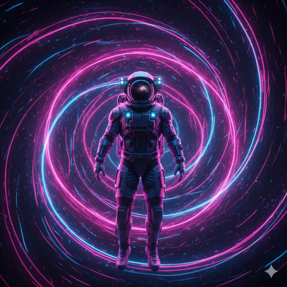 A lone traveler drifting through a neon cosmic storm, holding the last spark of a forgotten universe. Bright, surreal, and alive with motion. A moment frozen in space before everything changes.