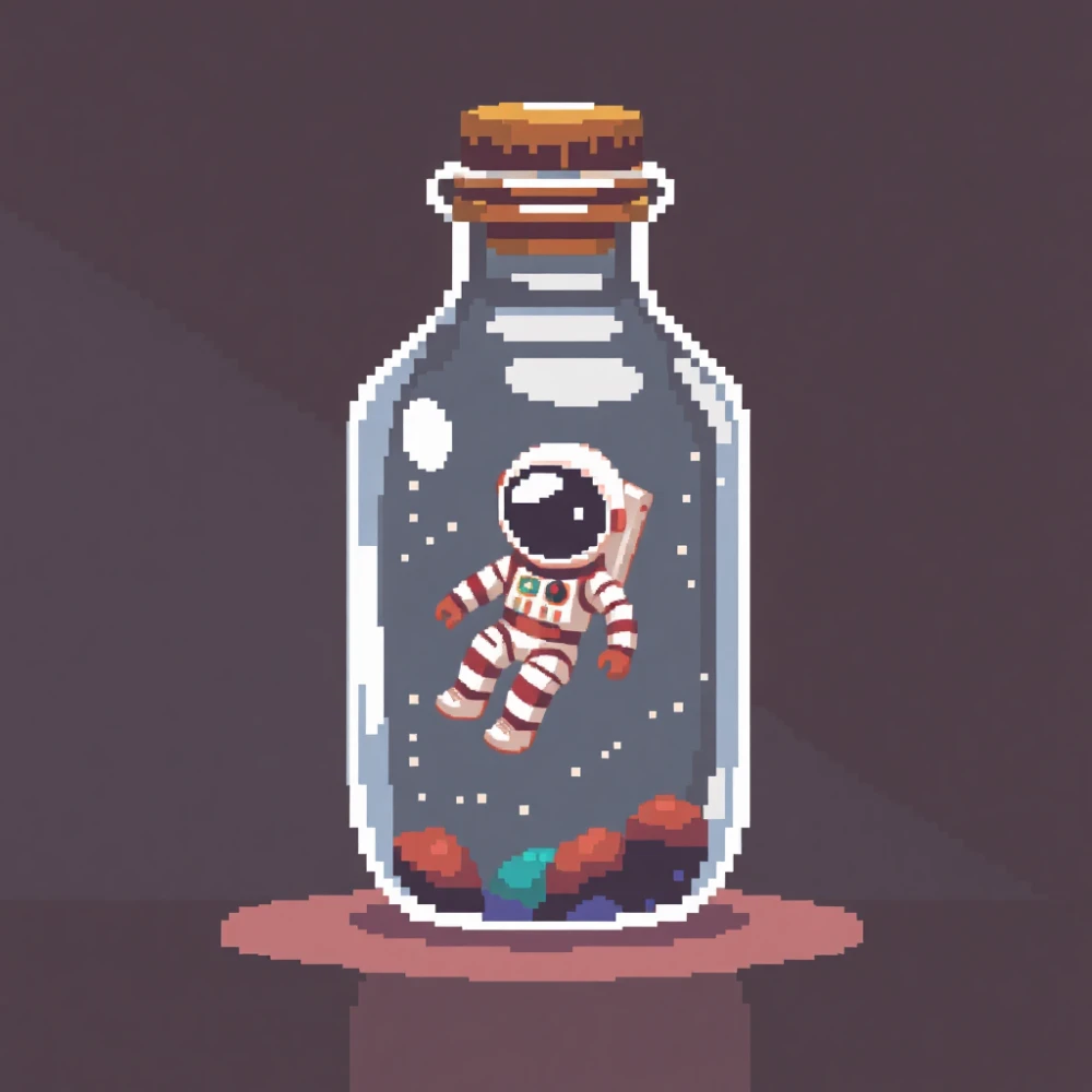 A tiny astronaut floating inside a glass bottle, whimsical art. pixel art