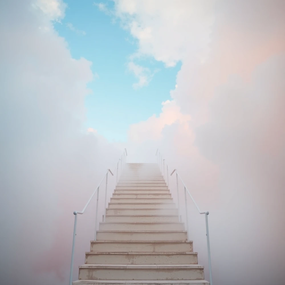 A staircase leading into the clouds, soft pastel colors, dreamlike atmosphere