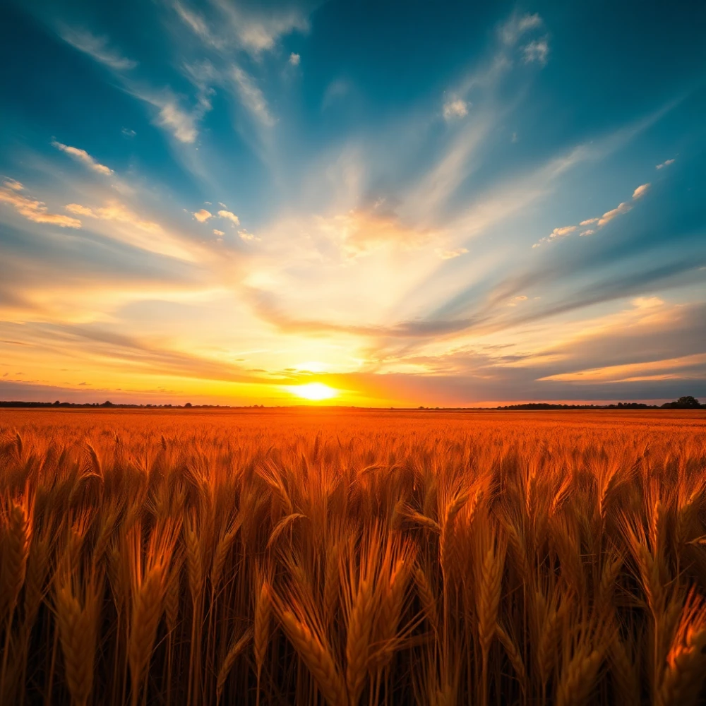 A golden wheat field under a dramatic sunset sky, cinematic wide shot