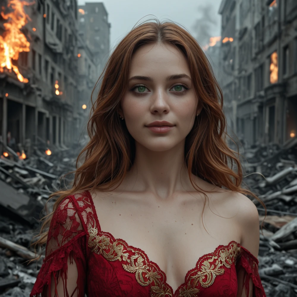 Beautiful woman in a gorgeous red dress in a war scene! total chaos. Created by AI!