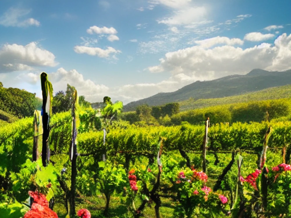 A beautiful garden full of blooming flowers, A vineyard with ripe grapes ready for harvest