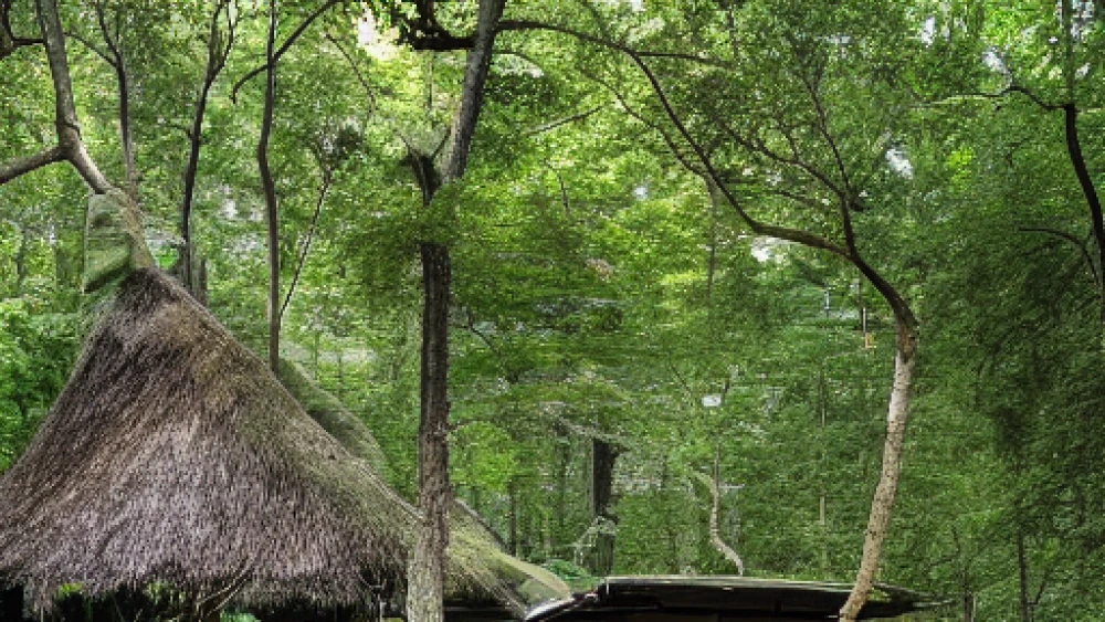 A treehouse in a dense forest, A deep canyon carved by a swift river