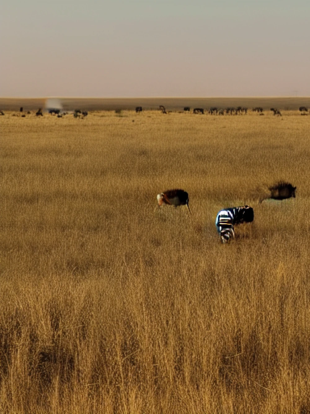 Endless plains of tawny grass stretch towards the horizon, teeming with majestic herds of wild beasts: antelopes with horns that shimmer like gold in the sunlight, zebras with coats as b