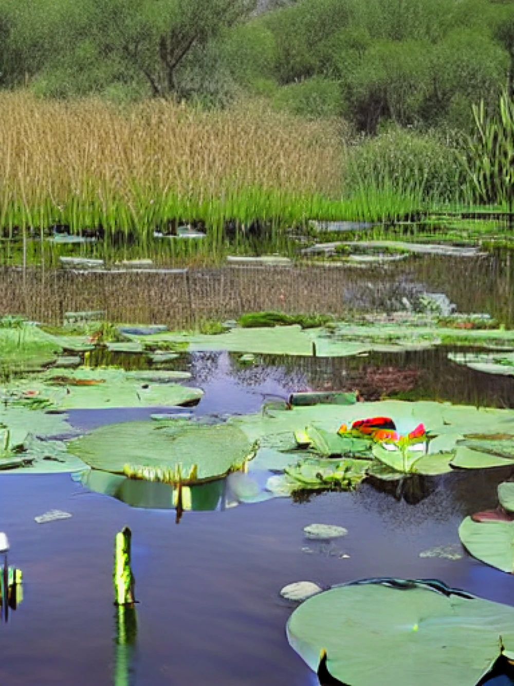A pond filled with waterlilies and lotus flowers, A desert landscape with sand dunes under the scorching sun