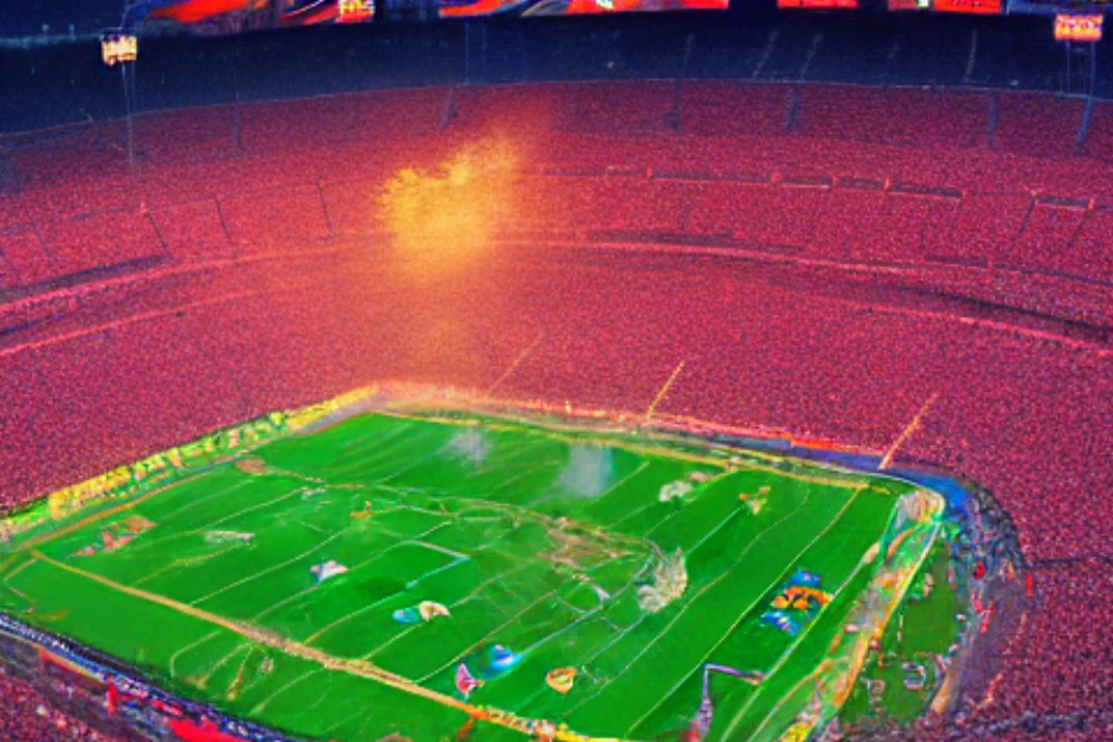 A cauldron of frenzied energy, the packed stadium erupts in a deafening roar as sixty thousand fans surge to their feet, their faces afire with passion. The electric air crackles with anticipation, a kaleidoscope of colors