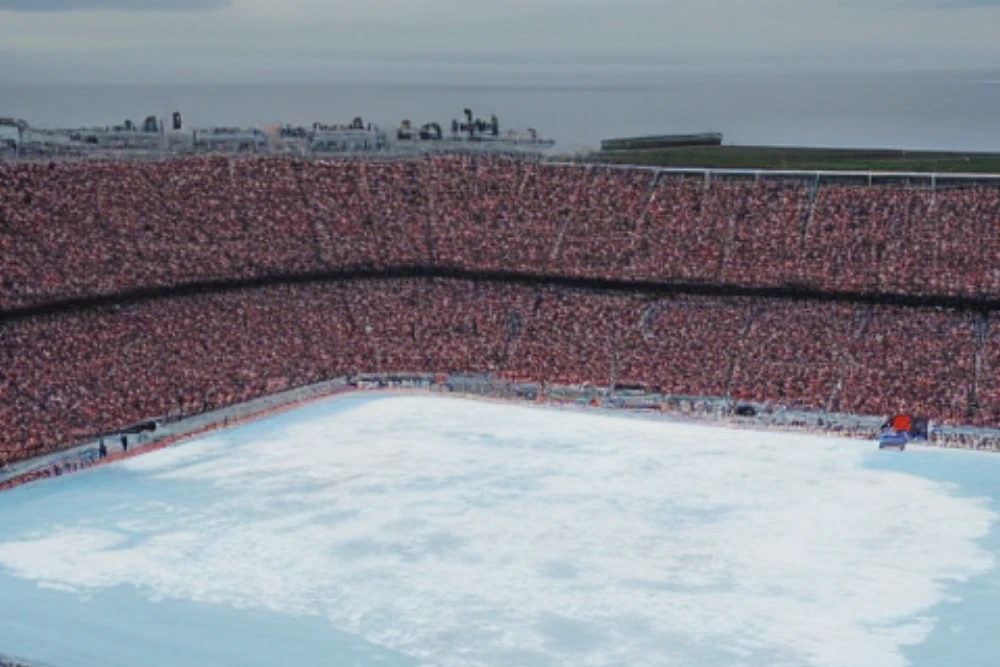 A packed stadium during a football match, A massive iceberg in the middle of the ocean