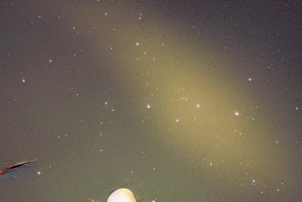 A telescope pointing at the night sky, A bird's nest with eggs on a tree branch