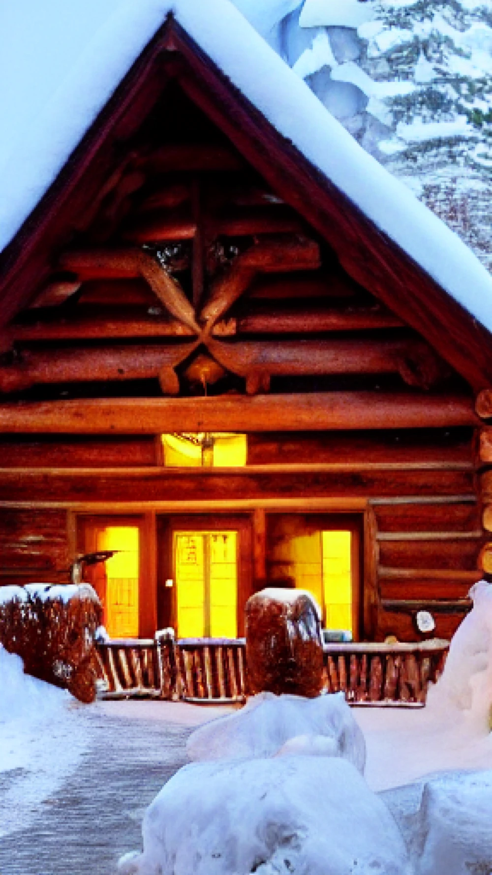 Snug amidst snow-laden pines, a rustic cabin beckons, its wooden slats weathered to a warm honey hue. Icicles cling to eaves, refracting winter's pale light into a kaleidoscope of colors. Smoke curling from the chimney, th