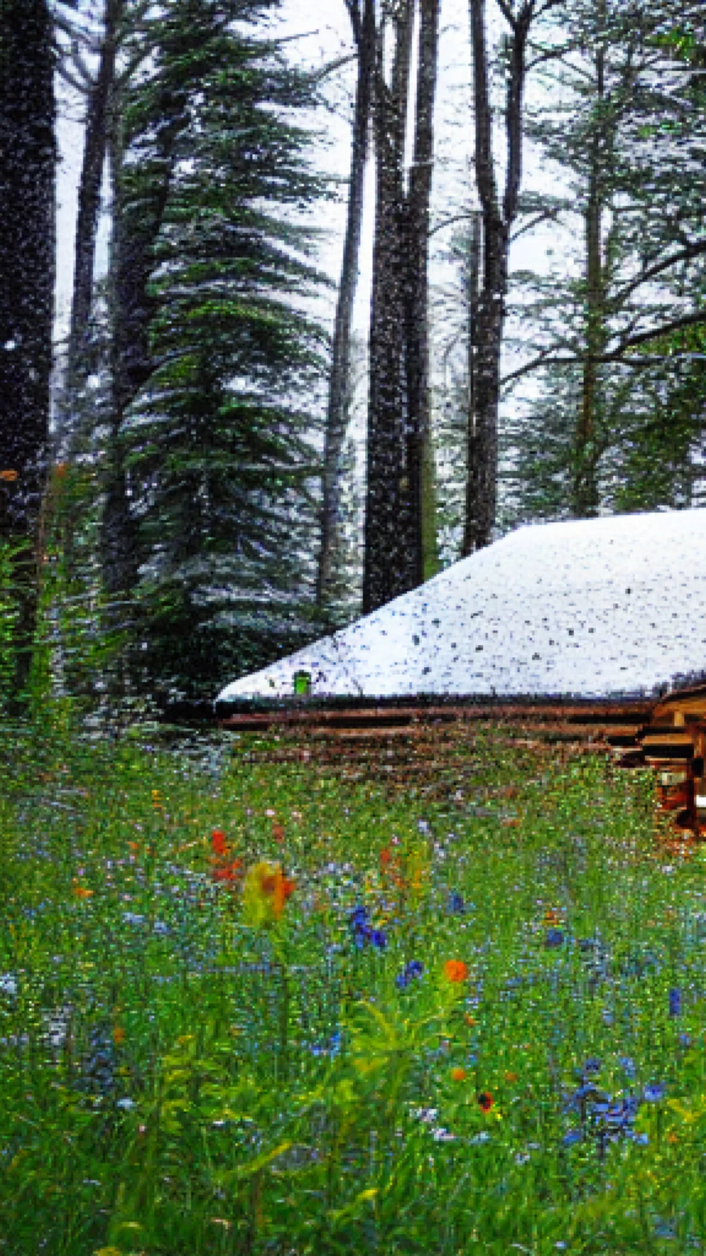A cozy cabin in a snowy forest, A meadow full of wildflowers in spring