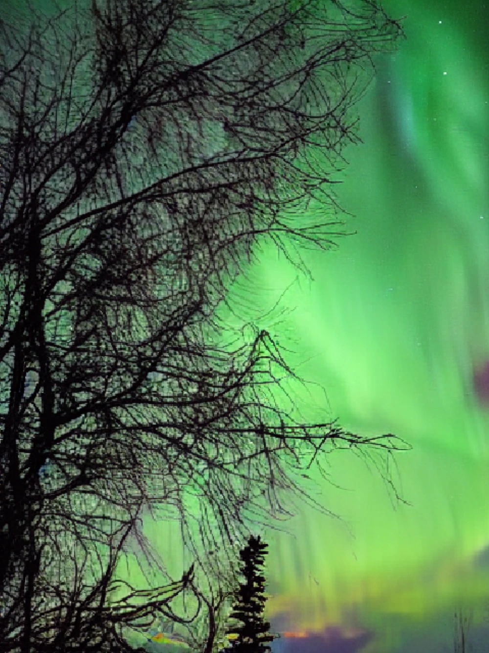 A bird's nest with eggs on a tree branch, The aurora borealis over a snowy landscape