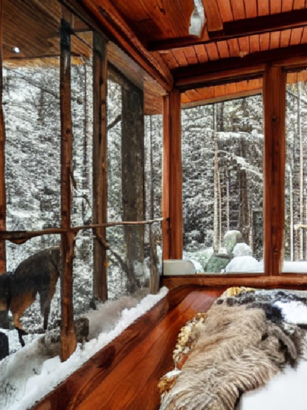 A cozy cabin in a snowy forest, A lush jungle with exotic plants and animals