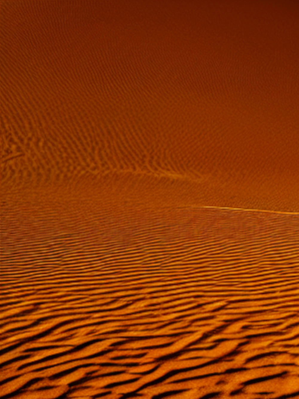 Golden sand dunes stretch towards the horizon, undulating like a sea of molten lava beneath the fiery blaze of the scorching sun, its relentless rays beating down upon the arid landscape, casting a warm orange glow that se