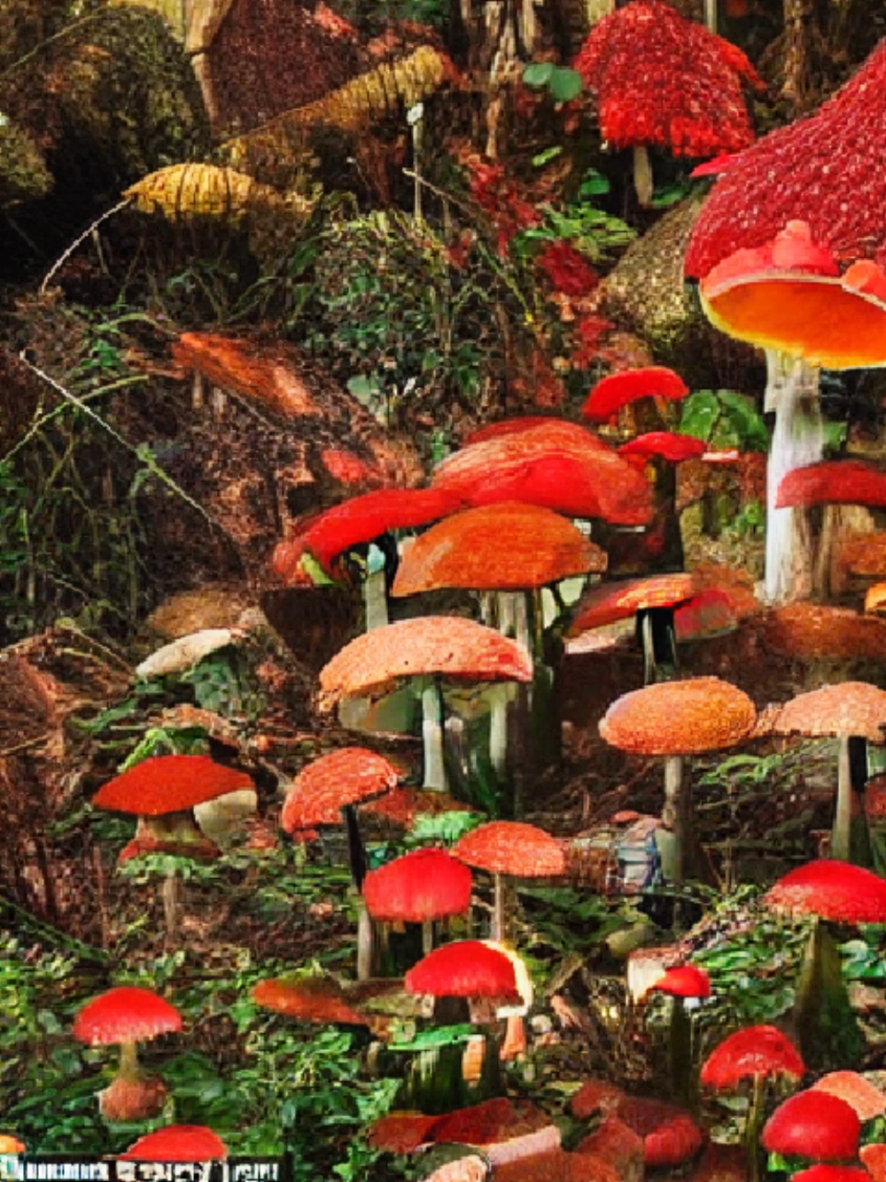 Amidst the forest's emerald veil, a cluster of mushrooms rose like tiny sentinels, their caps a vibrant tapestry of crimson, amber, and ivory hues. Delicate gills quivered in the breeze, releasing whispers of earthy scent