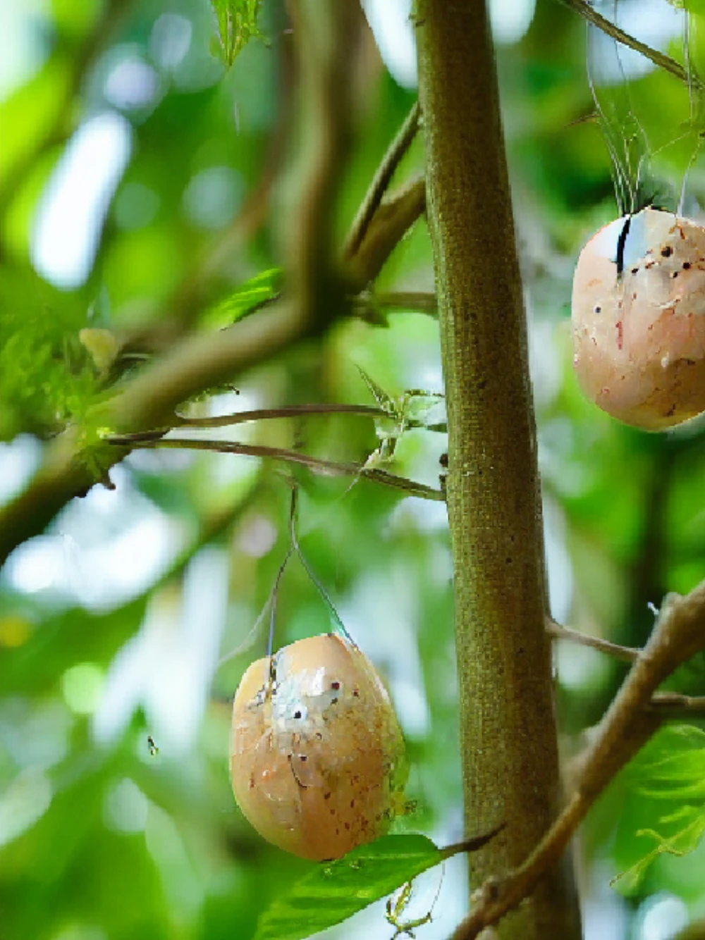 Amidst leafy verdure, a delicate nest cradles precious orbs on a slender branch, swaying gently in the breeze like a lullaby. Soft, creamy eggs gleam with dew-kissed promise, their speckled surfaces glistening like polished gemstones, as nature's tender m