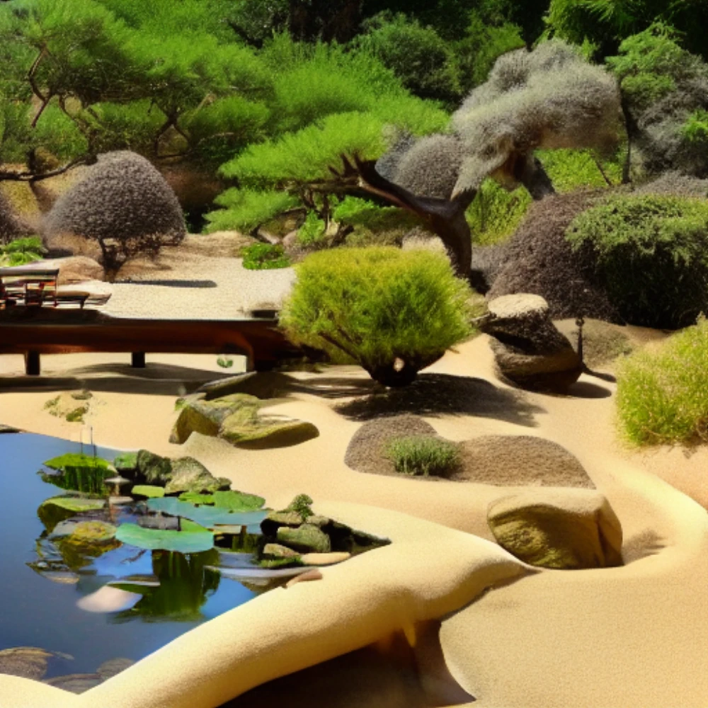 A tranquil zen garden with a koi pond, A desert landscape with sand dunes under the scorching sun