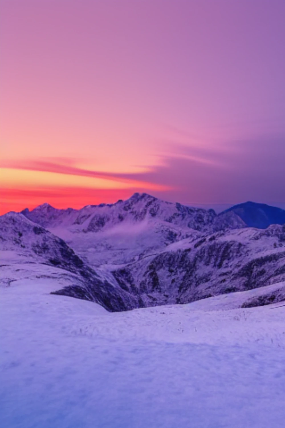 A snowy mountain range under a clear blue sky, A serene sunset over a calm ocean