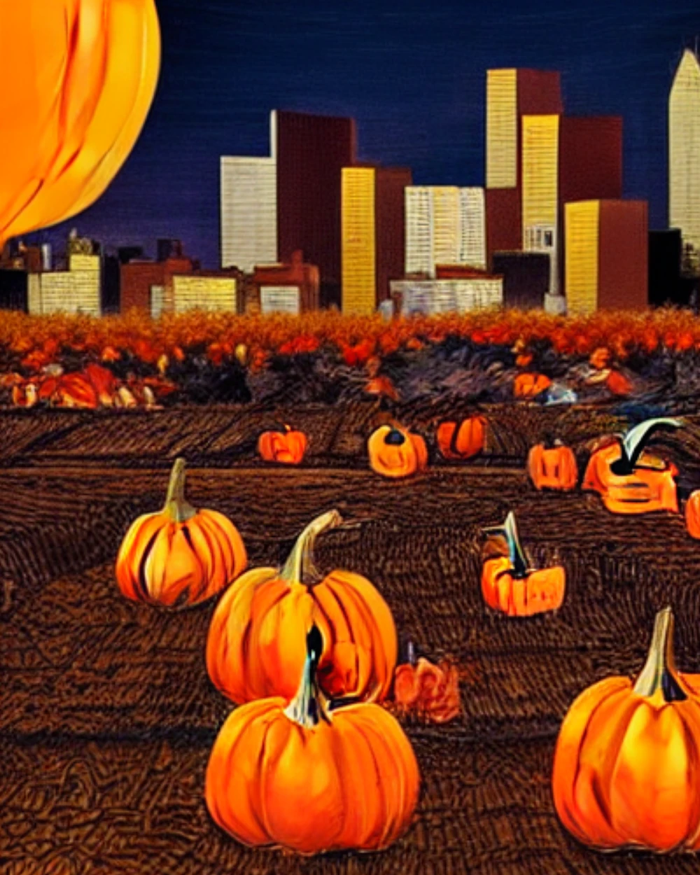 A pumpkin patch ready for harvest, A bustling cityscape at night