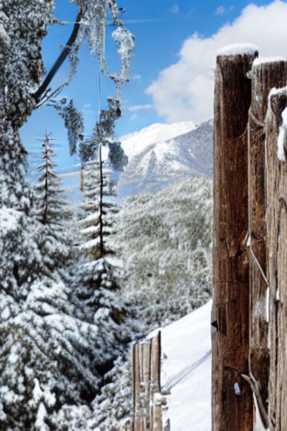 A snowy mountain range under a clear blue sky, A vine climbing up a rustic wooden trellis