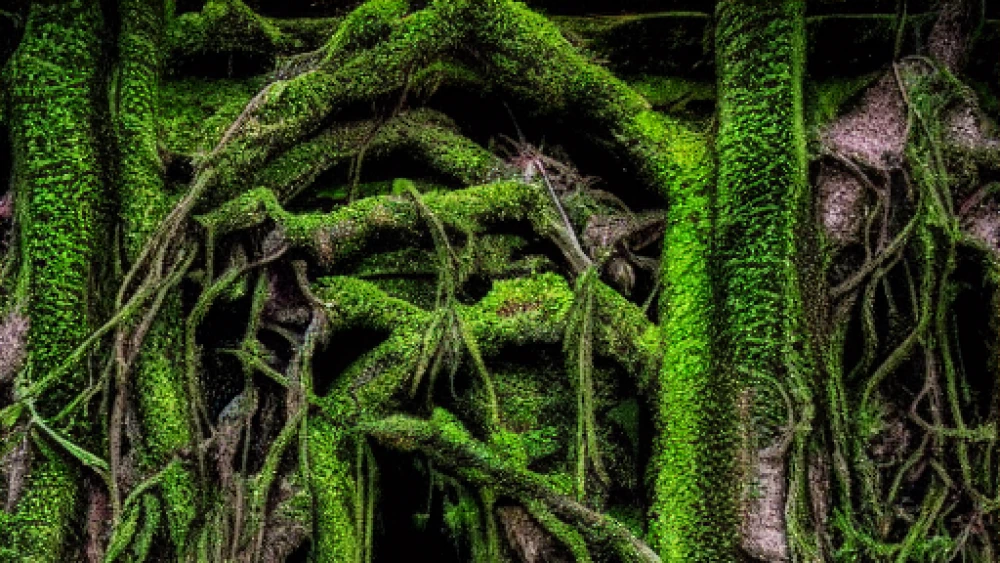 Velvet moss swaddles crumbling temples, as tendrils of ivy grasp worn stone columns like outstretched arms. Vines burst forth from weathered archways, their emerald shoots weaving a tapestry of life upon the relics of a fo