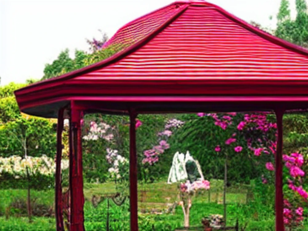 A gazebo in a rose garden, A fantasy landscape with floating islands