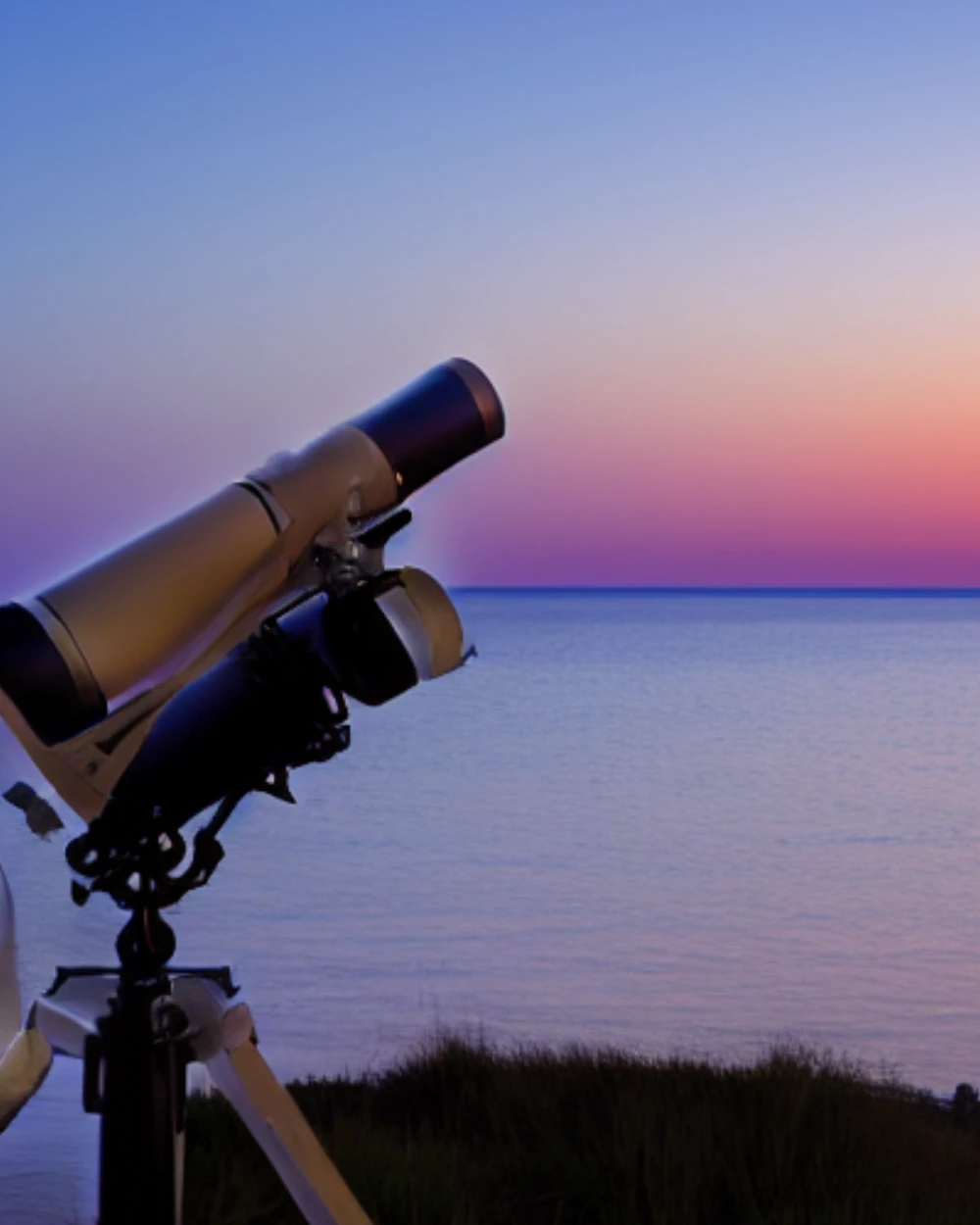 A serene sunset over a calm ocean, A telescope pointing at the night sky