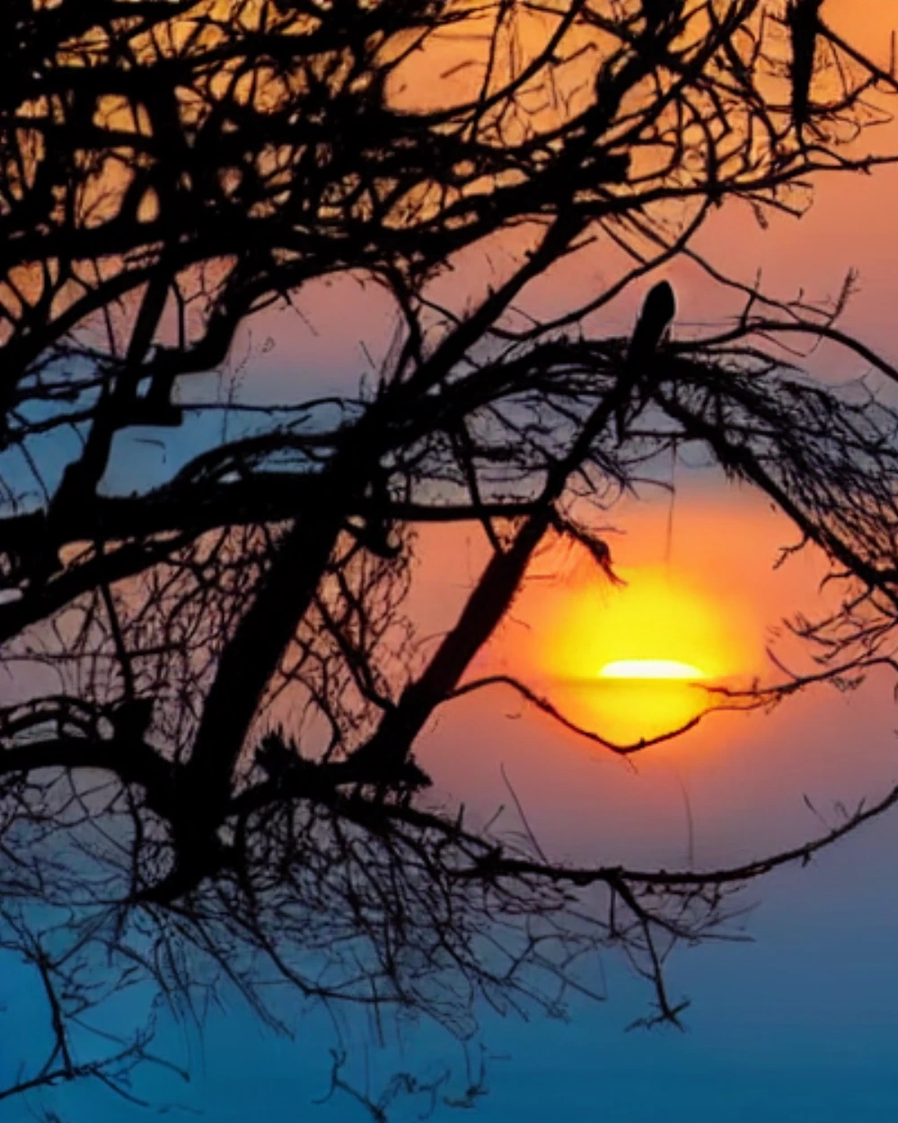A serene sunset over a calm ocean, A bird's nest with eggs on a tree branch
