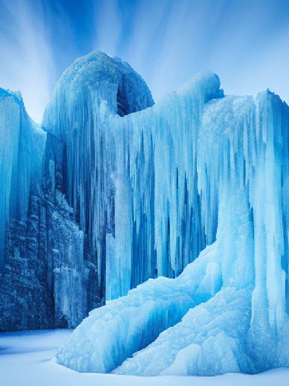 A colossal sentinel of frozen crystal rises from the dark blue abyss, its towering mass gleaming like a thousand shards of diamond in the pale sunlight, as the relentless waves caress its weathered flanks, whispering secre
