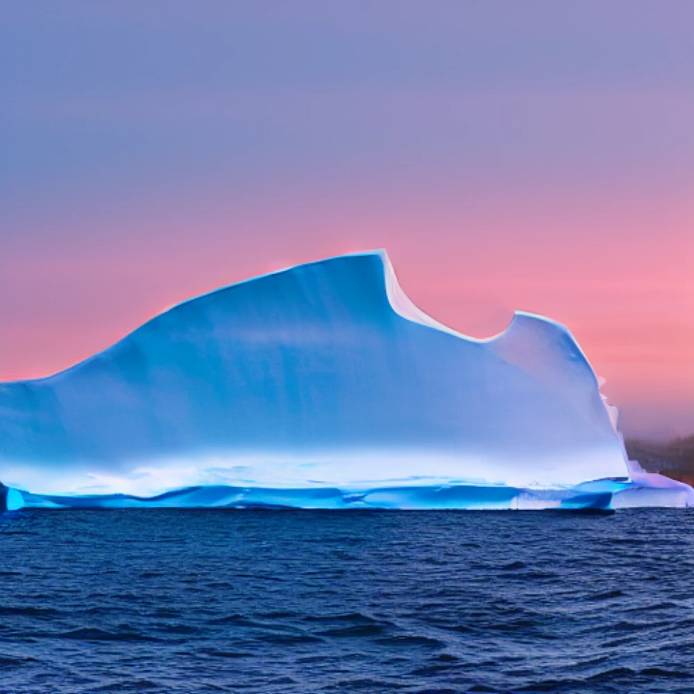 A panoramic view of a modern city skyline at dusk, A massive iceberg in the middle of the ocean
