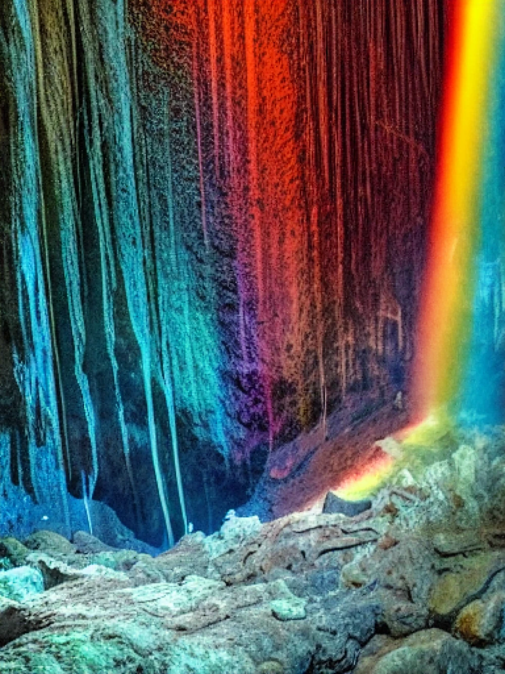 A stunning rainbow after a summer rain, A deep cave with stalactites and stalagmites