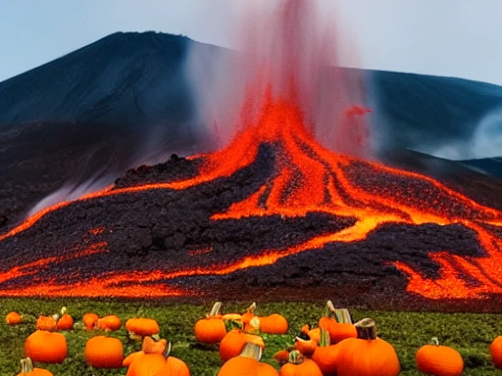 An active volcano erupting with lava, A pumpkin patch ready for harvest
