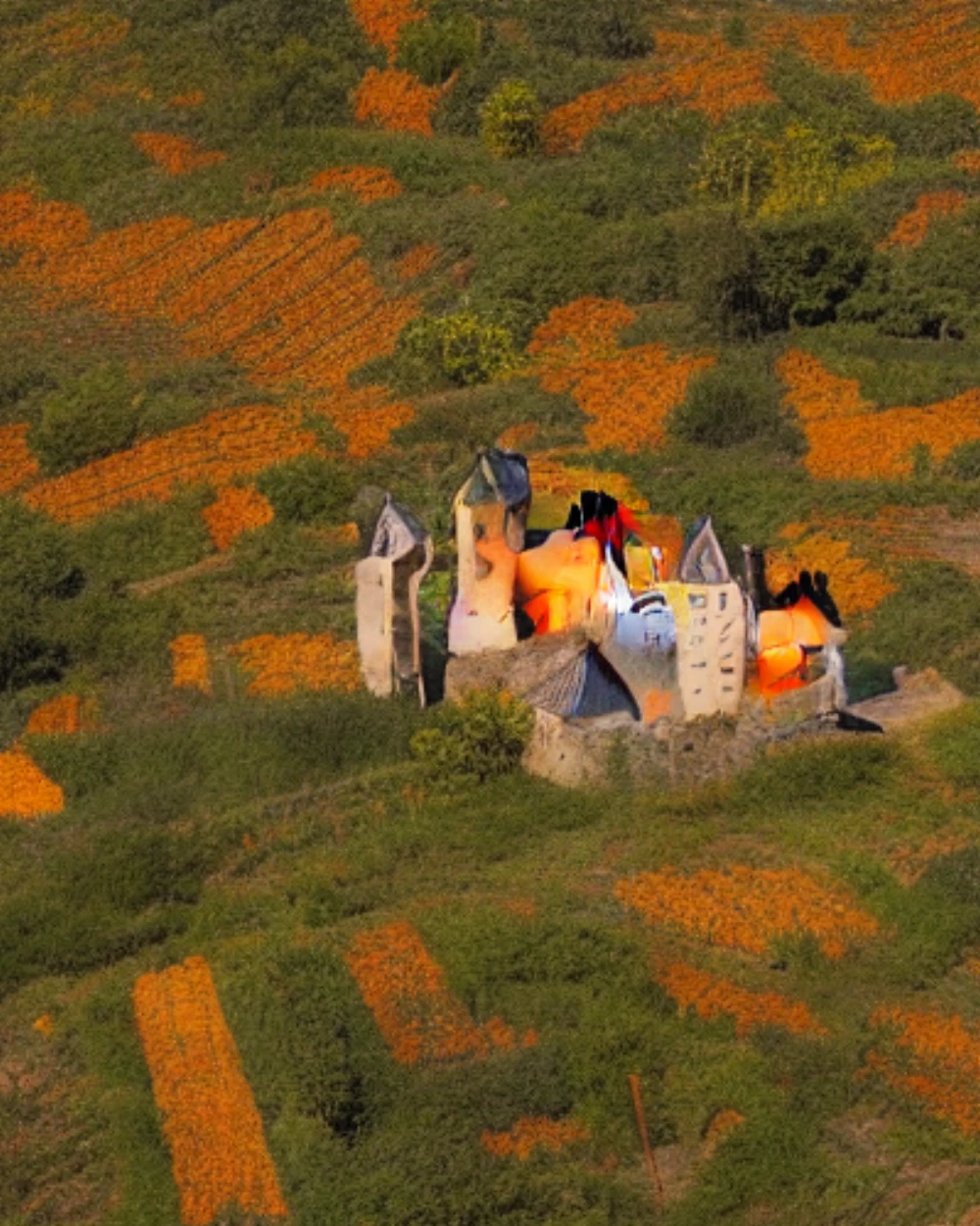 A pumpkin patch ready for harvest, A medieval castle on a hill