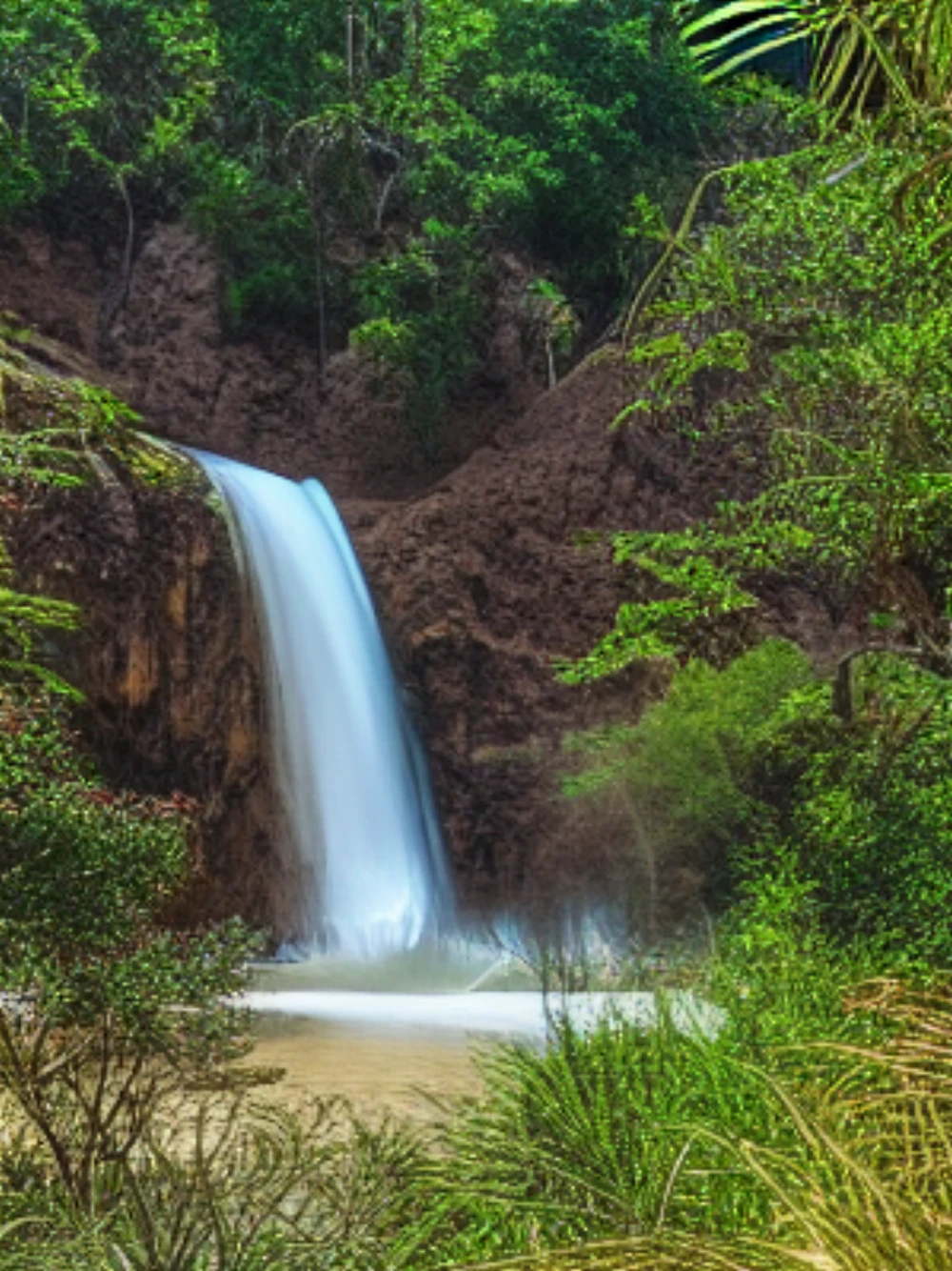 A desert landscape with sand dunes under the scorching sun, A hidden waterfall in a tropical forest