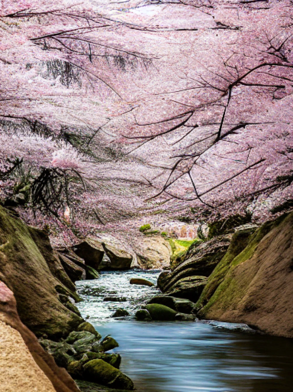 A deep canyon carved by a swift river, A cherry blossom tree in full bloom