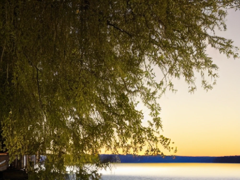 A quiet lake under the moonlight, A vine climbing up a rustic wooden trellis
