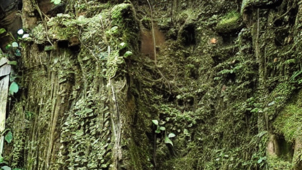 Vines ensnare crumbling temples, tendrils twisting like ethereal fingers around worn stone columns. Moss-drenched reliefs whisper secrets to the wind, as jungle verdure devours the ancient city, its legacy shrouded in a ta