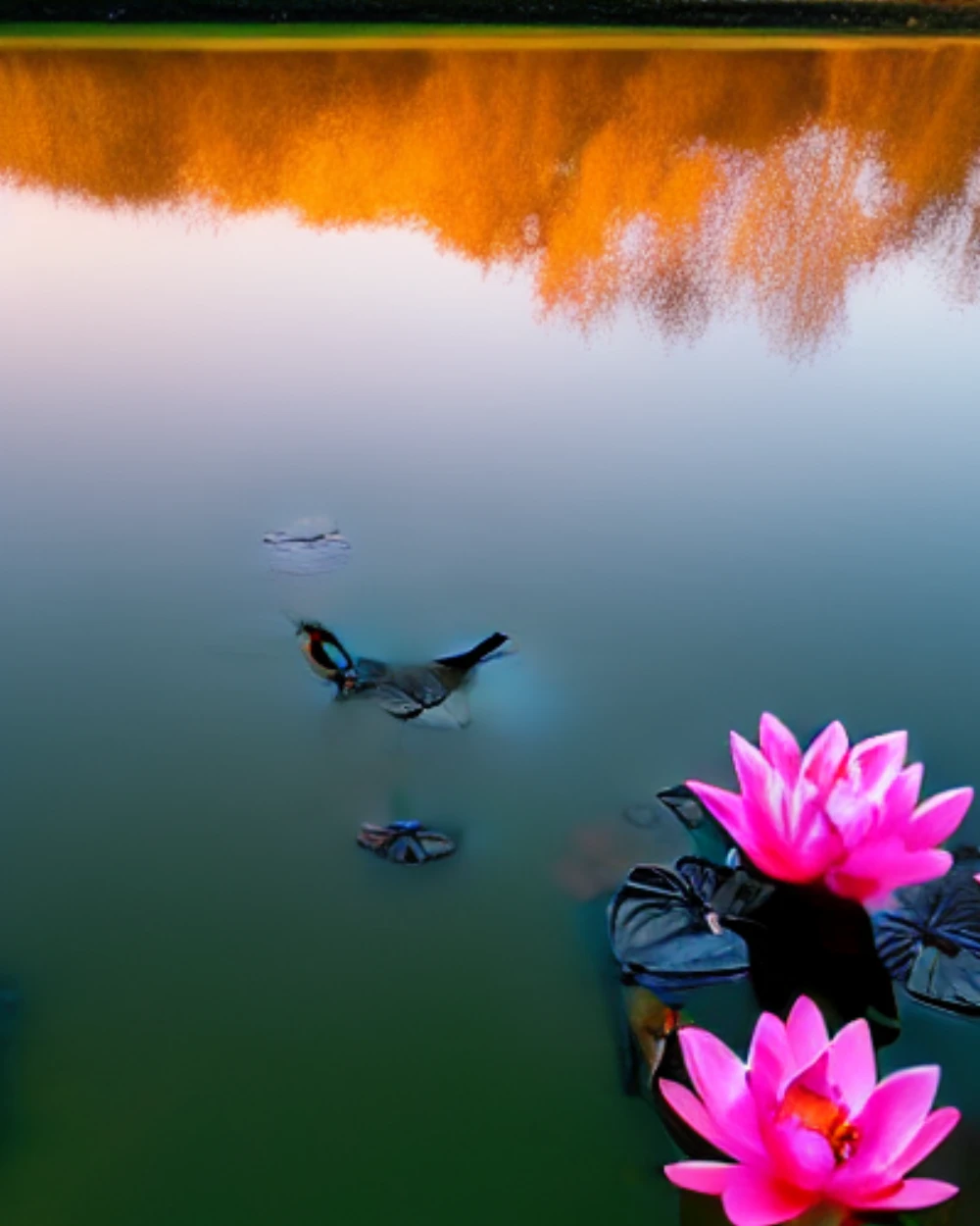 A pond with lily pads and blooming lotus flowers, A serene sunset over a calm ocean