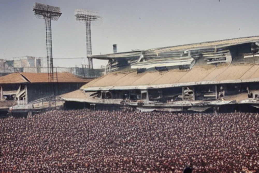 A packed stadium during a football match, A bustling marketplace in an ancient city