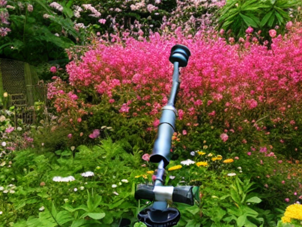 A beautiful garden full of blooming flowers, A telescope pointing at the night sky